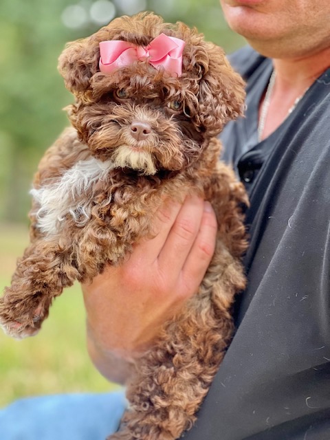 Meet Kitty, our adorable Shih-Poo female puppy! With her soft curls and a lovely mix of chocolate, brown, cream, and hints of black, she’s not just a treat for the eyes. Her gorgeous light-colored eyes are as sweet as her name suggests. Shih-Poos are known for being playful, affectionate, and great with families, making them the purr-fect addition to your household. Just like a playful kitten, Kitty will bring joy, cuddles, and a lot of laughter to your lives. She’s ready to sprinkle some cuteness and companionship into your family!