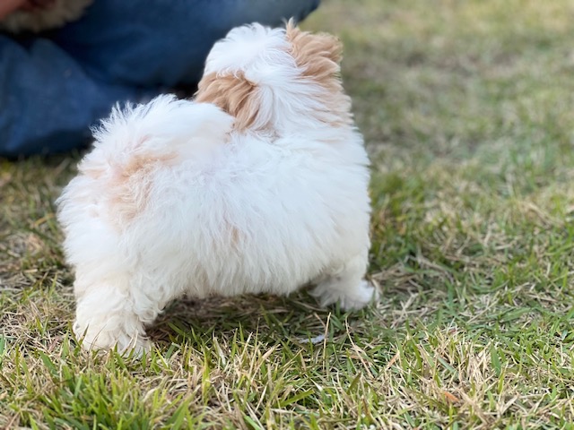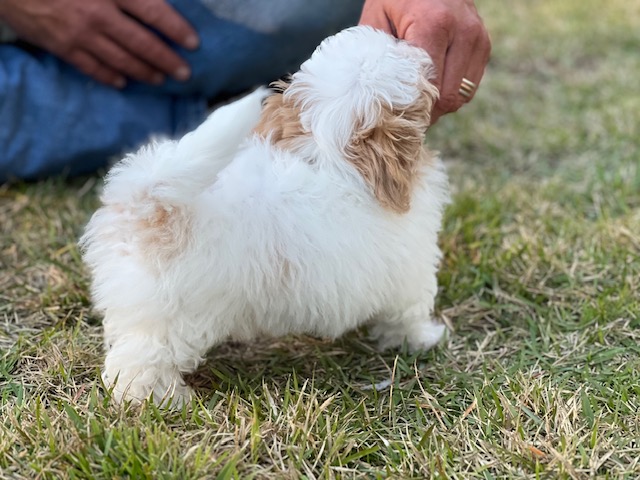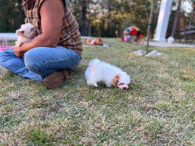 This sweet girl is Snobelle and she is a Maltipoo girl that is precious as they come! She has a really nice coat of bright white hair and apricot markings in the perfect places. She has a compact little body with cute short legs, dark eyes and an outgoing personality. Snobelle is super sweet and fun, she is going to make some lucky family really happy for years to come.