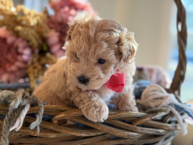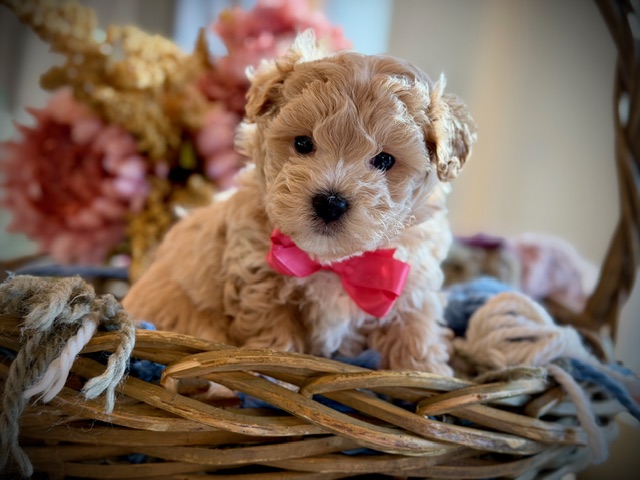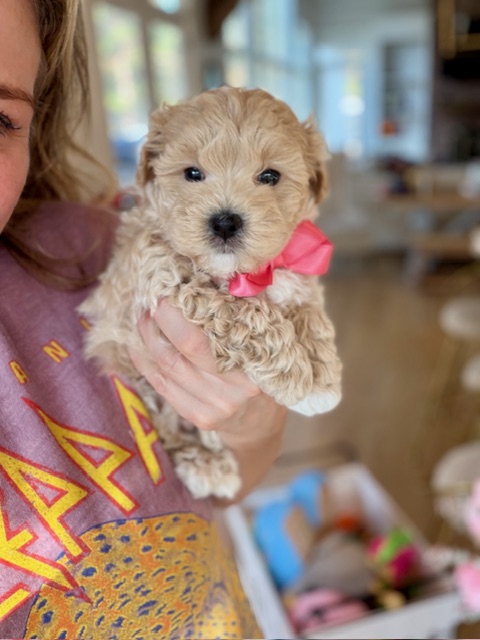 $2,500.00Click Here: More About PeachesMeet Peaches 🍑—a petite Toy Maltipoo with the soft, peachy-cream coloring to match her sweet name and a face that looks like it was made for cuddles. She’s gentle, affectionate, and full of that happy little spark that makes Maltipoos such wonderful companions. Because she’s very small, Peaches will thrive best with a family who understands the extra attention, stress free home, and thoughtful care a tiny puppy deserves. If you’re looking for a loving, joyful addition who brings warmth, laughter, and lots of snuggles into your home, Peaches would fit right in. 🐾💗