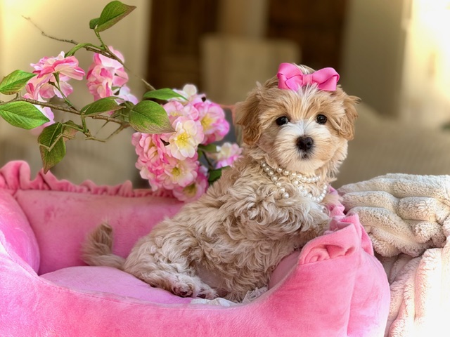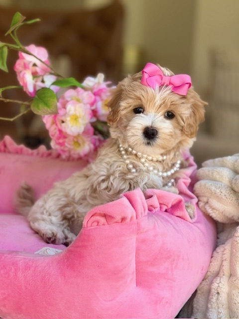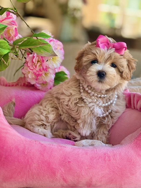$2,200.00Click Here: More About PearlPearl is a sweet little Maltipoo who truly lives up to her name… a rare, precious gem with a quiet kind of beauty 💕 She may not be overly impressed with all the photo sessions, but in person, her gentle nature and soft charm absolutely shine. With her petite frame, fluffy coat, and loving personality, Pearl is the kind of special puppy who doesn’t need the spotlight to be unforgettable—she simply is.