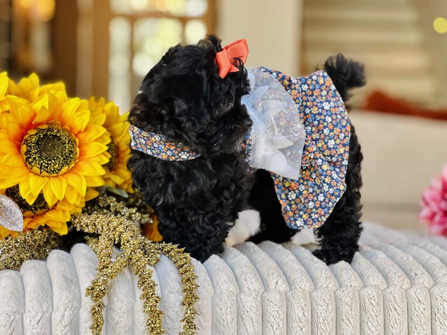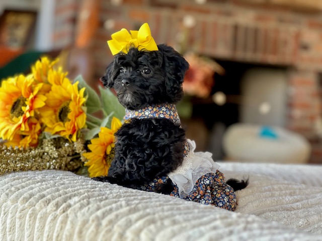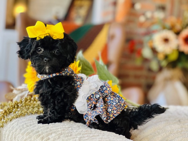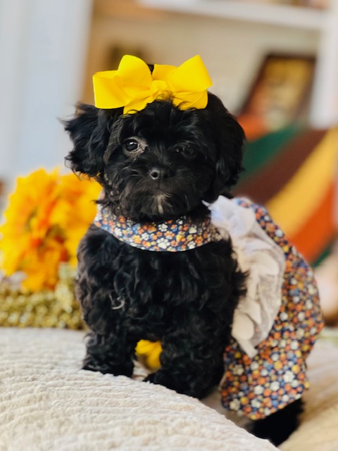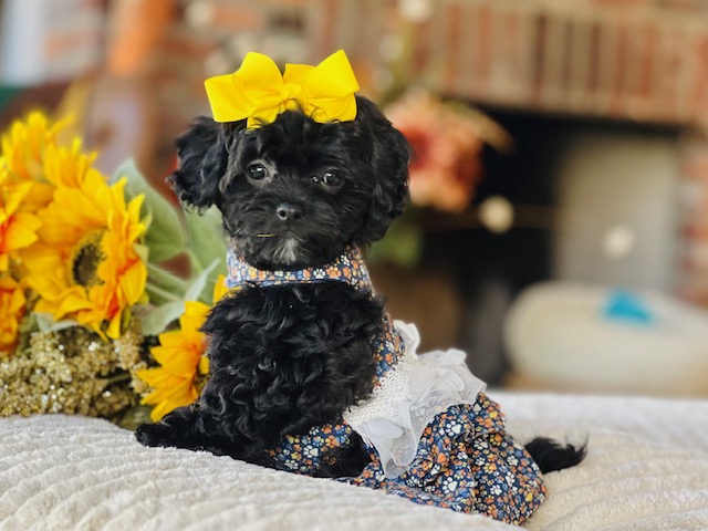 $1,800.00Hi there! My name is Black Beauty, and I bet you can guess why—my coat is the shiniest, blackest hair you’ve ever seen! My name just fits because I am a beauty in black, after all. I’m a little Shih-Poo girl with the softest, most relaxed curls, a cute teddy bear face, and these adorable short legs on my compact little body. I have a sweet and fun personality, so I’m an absolute joy to hang out with without being high-strung. You know, the Shih-Poo mix is known for being super smart and loving, which I totally am. I know my good looks and playful spirit will bring so much warmth and happiness to your house, making me the best new member of your family!