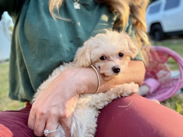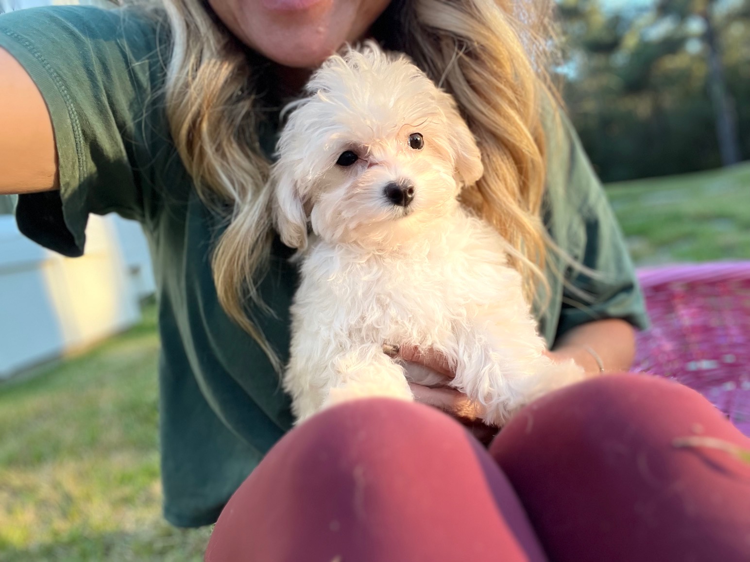 $2,500.00Click Here: More About PearlThis beautiful little angel is a Maltipoo puppy that we call Pearl. She is a bright white color with soft cream ears. Pearl has a sweet and loving personality, it’s so much fun to watch her bounce around and play with her soft little toys. She is going to make a wonderful addition to some lucky family for years to come!