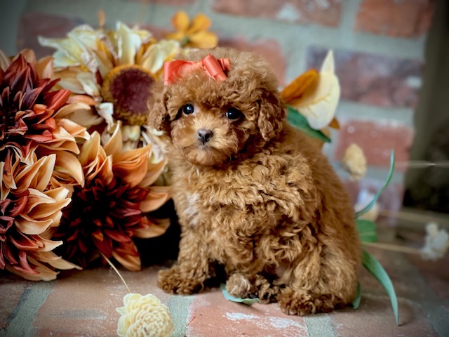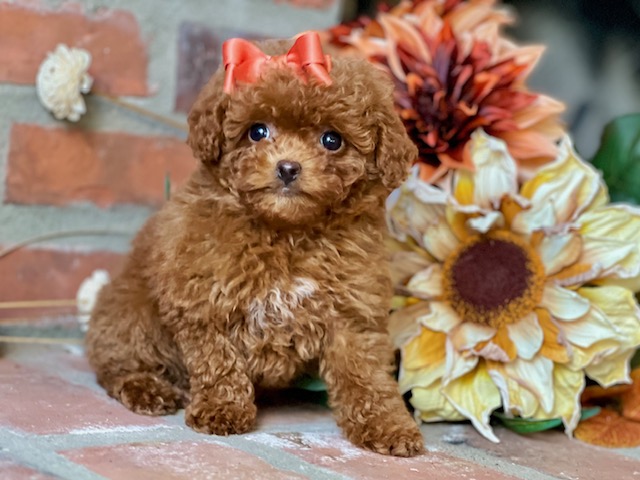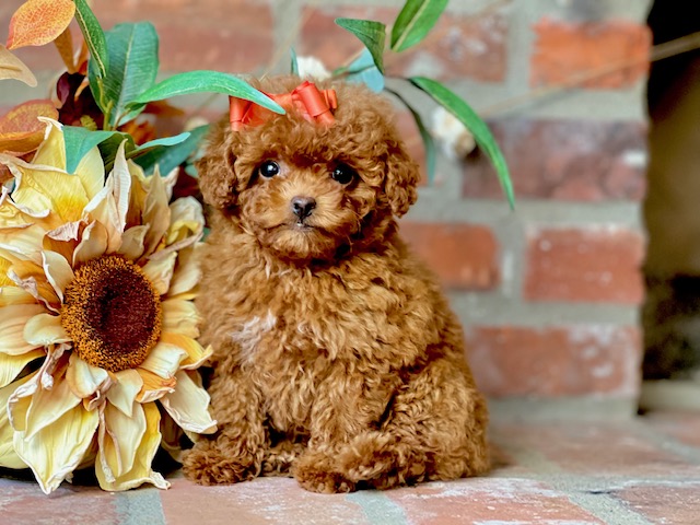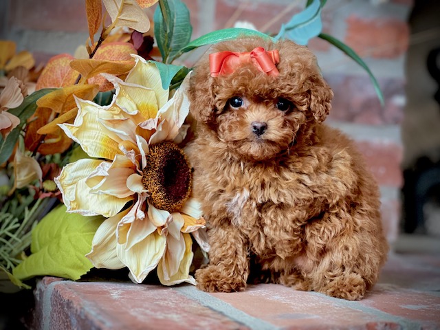 What a pretty little Princess Puppy!! This sweet girl is perfection! She is smart, fun, super soft, loving and sooooo much more. Curley Sue has that gorgeous red coloring, petite compact body, and perfect teddy bear face. Can u image sticking her in ur purse for all of y’all’s fun adventures! Call about her today!