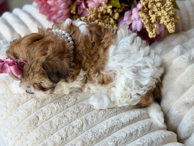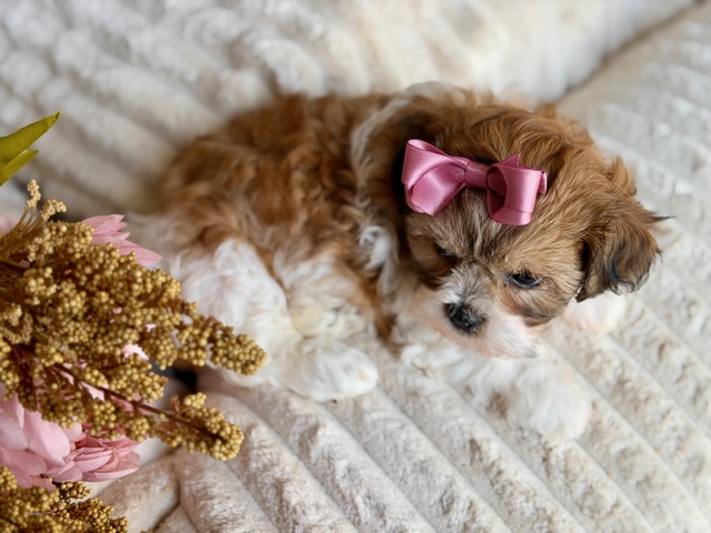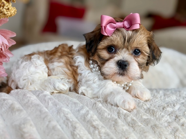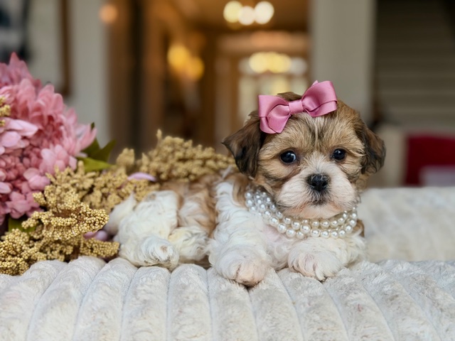 Fanny is a beautifully colored Shih-Chon with the cutest short legs, a compact little body, and a perfect teddy bear face that stops people in their tracks. She’s sweet, smart, and already knows how to charm her way into extra cuddles and attention. With her gentle personality and playful spark, Fanny is the kind of puppy who makes every day feel a little happier—and funnier—just by being around. 🐾💗