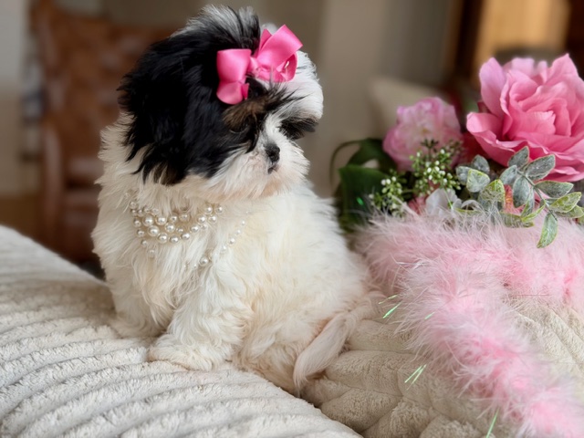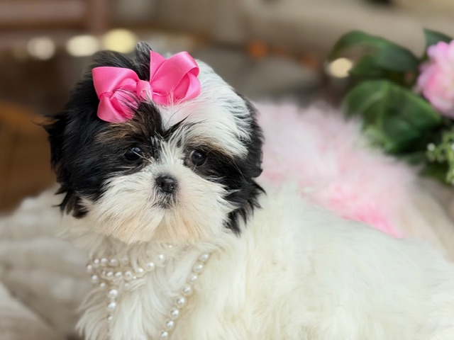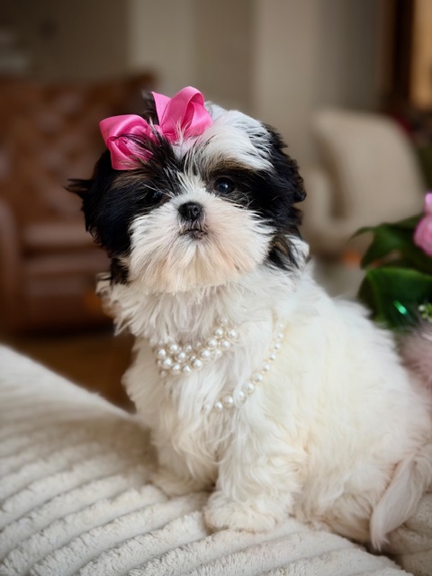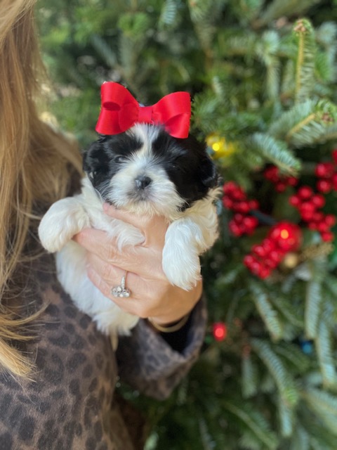 Meet Gracie, a precious black-and-white Shih-Tzu girl who looks like she was dipped in holiday magic and topped with a bow. She loves lounging around, soaking up snuggles, and rolling over for belly rubs like it’s her full-time job. With her gentle spirit and festive charm, Gracie would make a wonderful addition to any family looking for a sweet, loving companion to brighten every season.