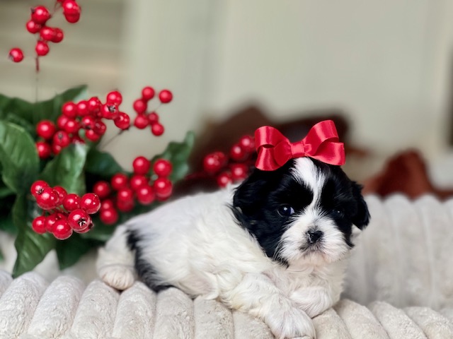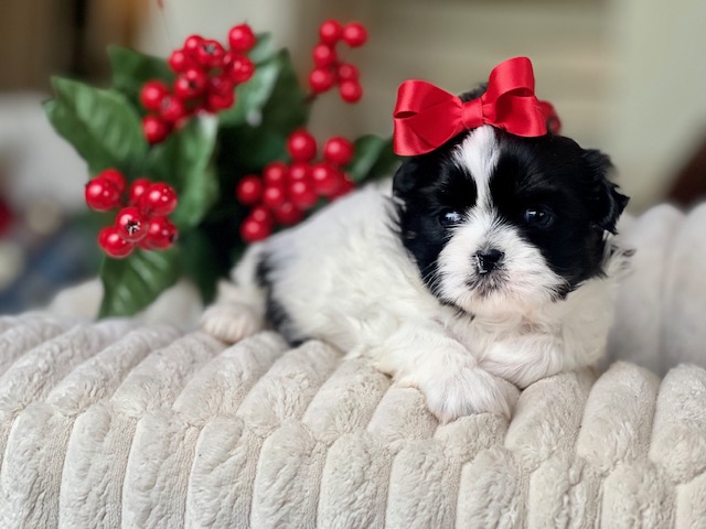 $2,300.00Click Here: More About GracieMeet Gracie, a precious black-and-white Shih-Tzu girl who looks like she was dipped in holiday magic and topped with a bow. She loves lounging around, soaking up snuggles, and rolling over for belly rubs like it’s her full-time job. With her gentle spirit and festive charm, Gracie would make a wonderful addition to any family looking for a sweet, loving companion to brighten every season.