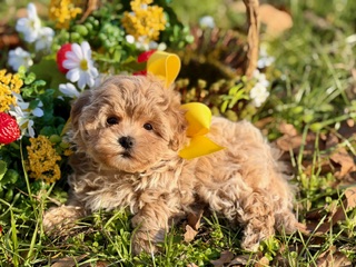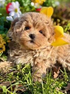 $2,500.00Click Here: More About GradyGrady is the kind of Maltipoo that makes you stop and look twice — with gorgeous curls in a rich, beautiful color, soulful dark eyes, and a teddy bear face that feels almost unreal. He’s incredibly sweet by nature, gentle in spirit, and happiest when he’s close, soaking up love and giving it right back. Small, cuddly, and full of heart, Grady is pure charm wrapped in curls.