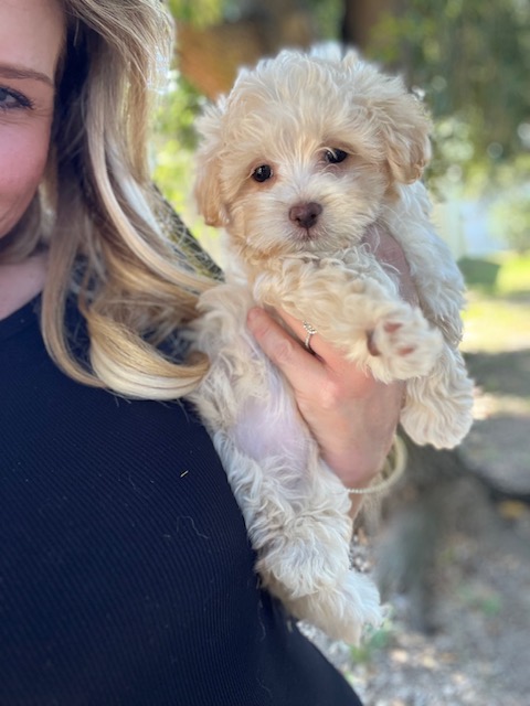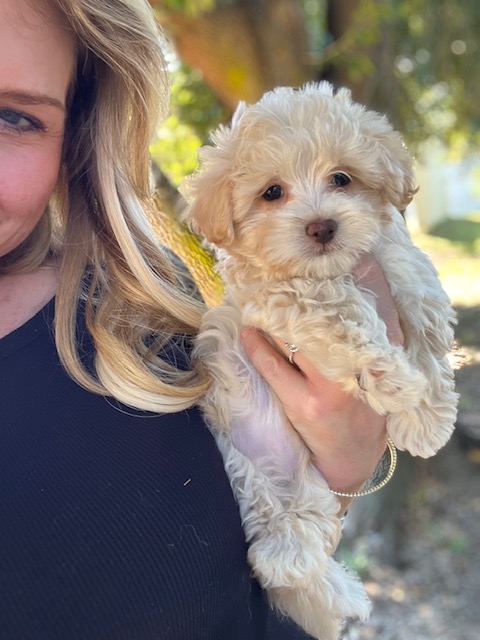 $2,300.00Yes, Can you believe it? You are seeing a real live teddy bear right before your eyes! This little Teddy Bear is a Maltipoo puppy with the most beautiful coloring, and a coat full of soft curls. He is a petite little fella, that should be just the perfect size to go on all of your travel adventures. Don’t miss out on little Teddy Bear!!