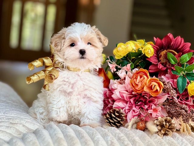 $2,000.00Meet Barlow, this handsome fella is a precious male Mal-Shih puppy. He has that beautiful brown and white coloring with black markings in just the right places. He’s the chubbiest baby in the litter, his little belly is so cute! Just because he is the biggest one now does not mean he’s going to be a bigger puppy. It just means that he’s the best at getting to mamas milk. Mal-Shih are such a wonderful breed! No wonder they are one of the most sought after. Call about Barlow today.