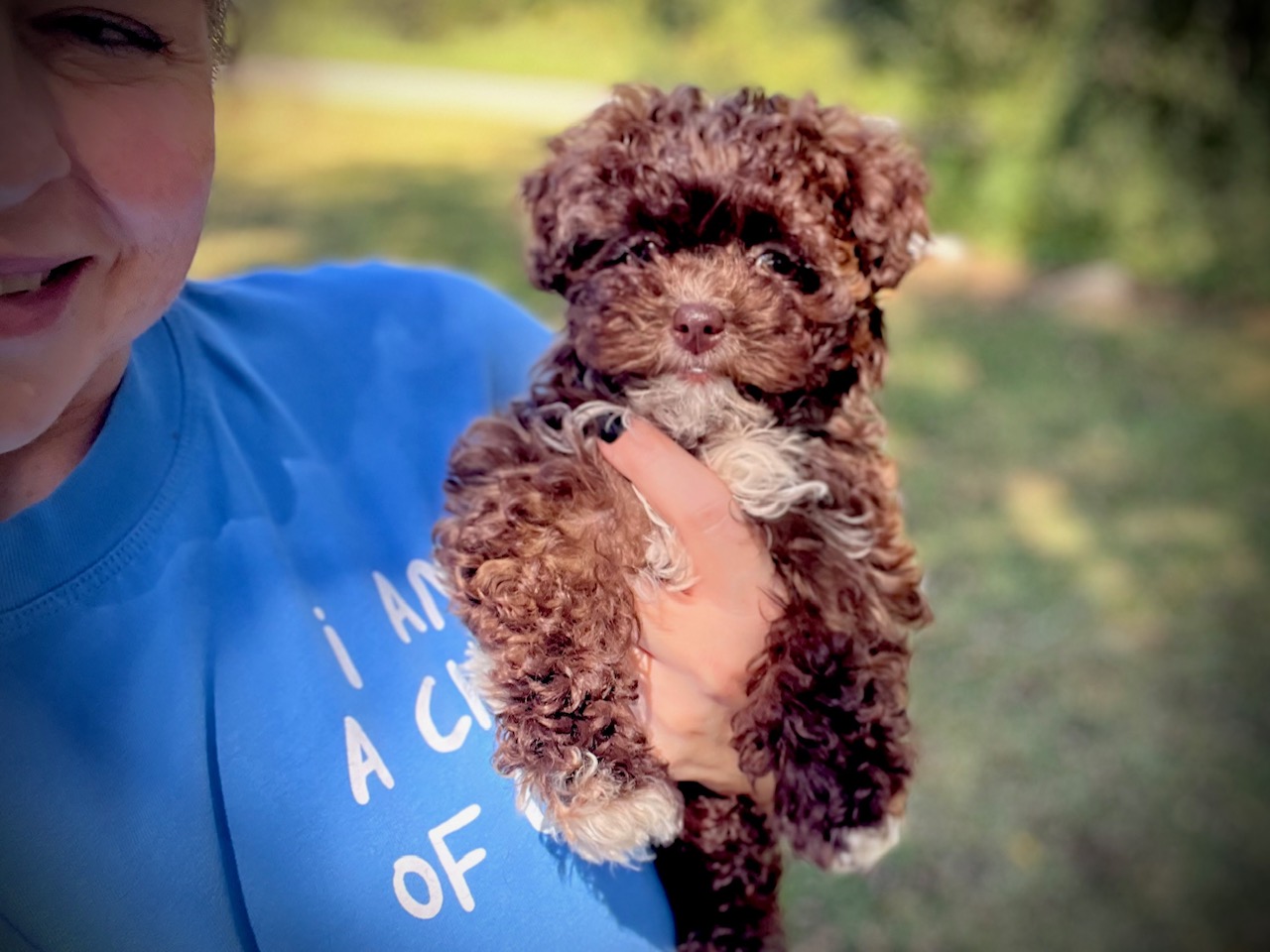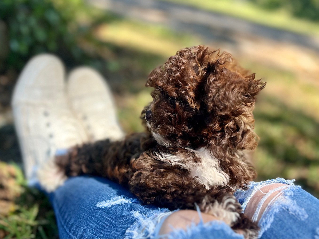 Meet Kitty, our adorable Shih-Poo female puppy! With her soft curls and a lovely mix of chocolate, brown, cream, and hints of black, she’s not just a treat for the eyes. Her gorgeous light-colored eyes are as sweet as her name suggests. Shih-Poos are known for being playful, affectionate, and great with families, making them the purr-fect addition to your household. Just like a playful kitten, Kitty will bring joy, cuddles, and a lot of laughter to your lives. She’s ready to sprinkle some cuteness and companionship into your family!