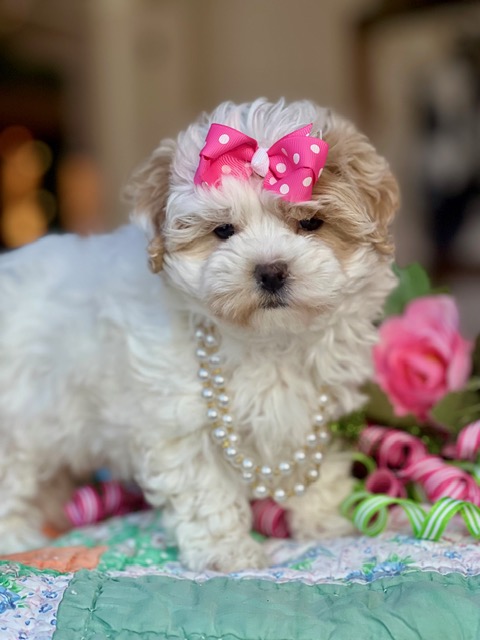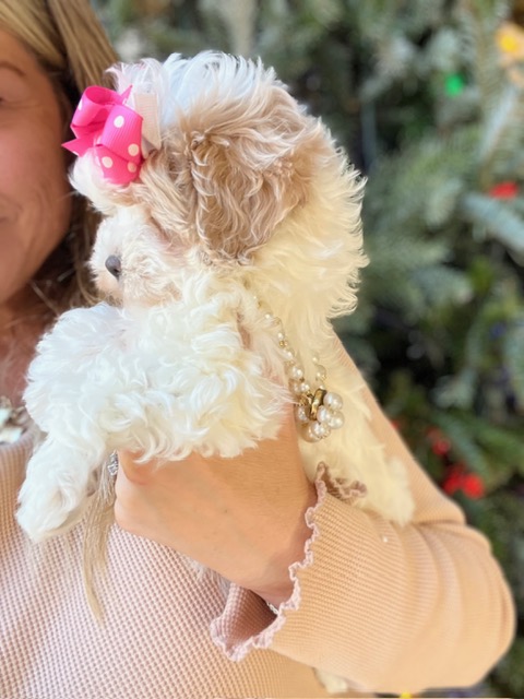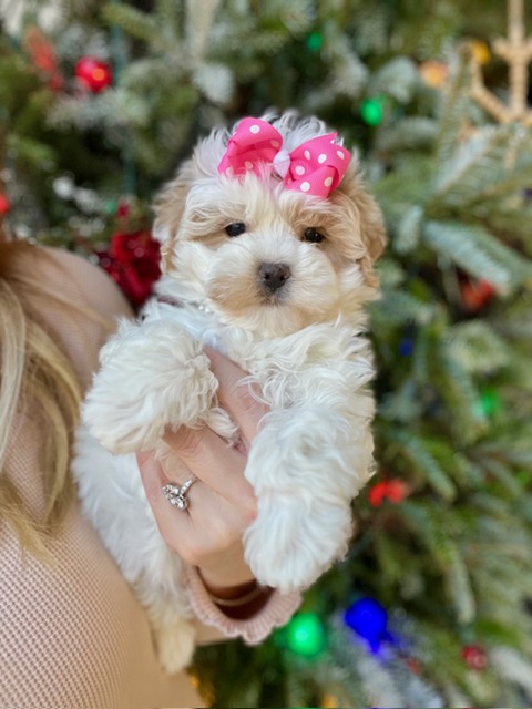 Hi, I’m Lovely 💕 I’m a sweet little Maltipoo girl with fluffy curls you can’t help but touch and a teddy bear face that gets me lots of compliments. I’m outgoing, happy, and always ready to be right by your side—whether that’s playing, cuddling, or following you from room to room. I can’t wait to be your best friend and bring extra love and smiles into our home. *Please note that she will be of age to go home before Christmas. With the timeline so close there may be a chance she will not be able to go home before Christmas if she’s not completely weaned and ready for her new home.