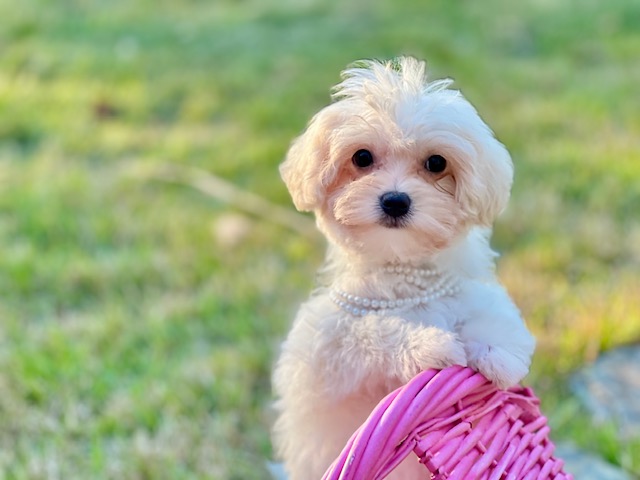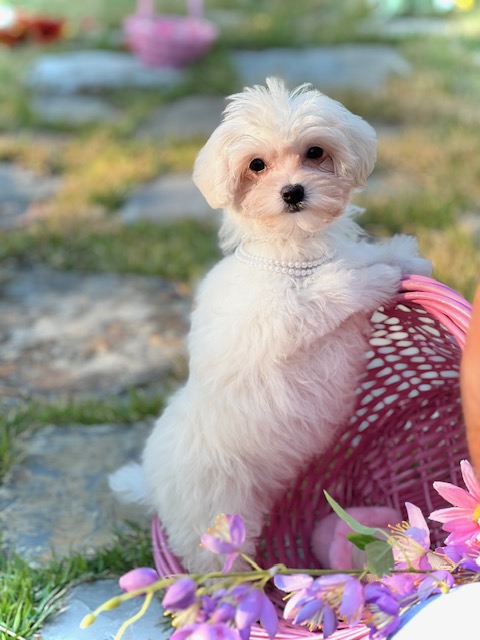 $2,000.00Click Here: More About MadelineGet ready to fall head-over-heels for Madeline, the sweetest little fluffball you’ll ever meet! She’s a tiny Maltipoo with a soft, snowy-white coat, expressive dark eyes and a perfect little button nose. Madeline is built for snuggling—she is compact and the definition of a lap puppy. While she’s definitely a little cuddle monster who will happily snooze on your chest, she also has a great playful side and is always up for a happy zoomie or a quick game of chase!