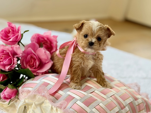 $2,600.00Click Here: More About MaximilianMeet Maximilan — a very big name for a very tiny Maltipoo. This creamy apricot cutie has petite features, dark sparkling eyes, and a fireball personality that’s larger than life. He may look like he could fit in your pocket now (don’t worry, he’ll grow a bit 😉), but Maximilan rules his world with confidence, charm, and is so much fun. Small in size, mighty in heart, and always ready to steal yours.