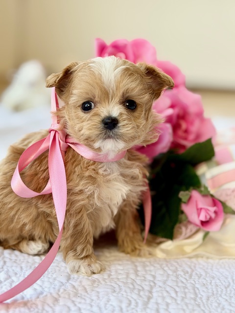 $2,500.00Click Here: More About PeachesMeet Peaches 🍑—a petite Toy Maltipoo with the soft, peachy-cream coloring to match her sweet name and a face that looks like it was made for cuddles. She’s gentle, affectionate, and full of that happy little spark that makes Maltipoos such wonderful companions. Because she’s very small, Peaches will thrive best with a family who understands the extra attention, stress free home, and thoughtful care a tiny puppy deserves. If you’re looking for a loving, joyful addition who brings warmth, laughter, and lots of snuggles into your home, Peaches would fit right in. 🐾💗