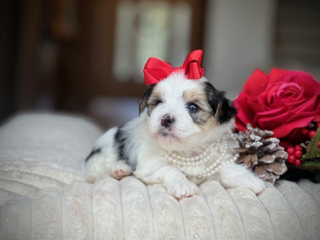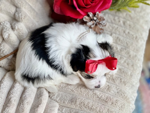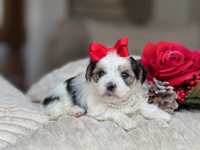 Meet Holly Belle, a tiny black and white Morkie puppy sprinkled with the sweetest tan markings and wrapped in the festive charm her little red bow suggests. Morkies like Holly Belle bring unwavering affection and playful, family-friendly energy into any home, making every day feel a bit like a celebration. With her soft fluff and gentle curiosity, Holly Belle seems ready to sprinkle joy wherever she curls up—your own little holiday heartbeat on four paws.