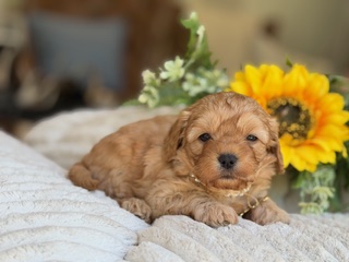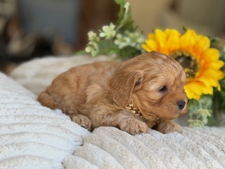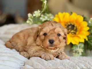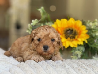 $2,200.00Click Here: More About GoldieGoldie is a precious laid-back little Cavapoo with the sweetest, easygoing soul. Her soft, golden coat and those deep, beautiful eyes give her a gentle, loving look that’s hard to resist. She’s the kind of girl who’s happiest curled up close, soaking in all the cuddles and quietly stealing your heart.
