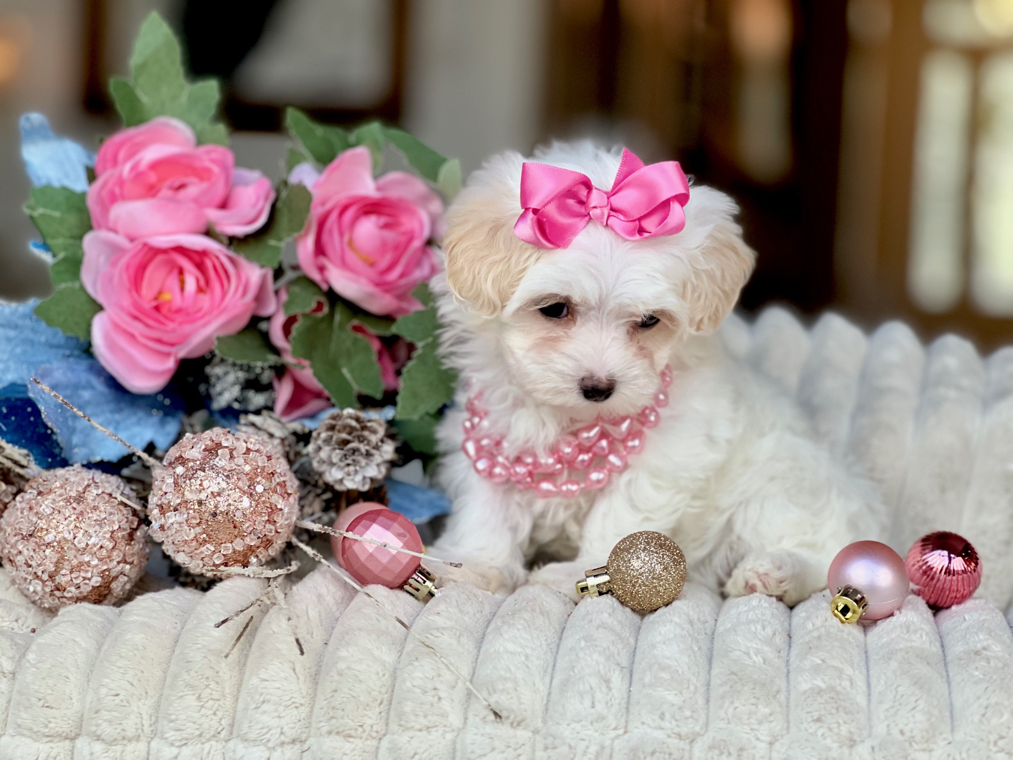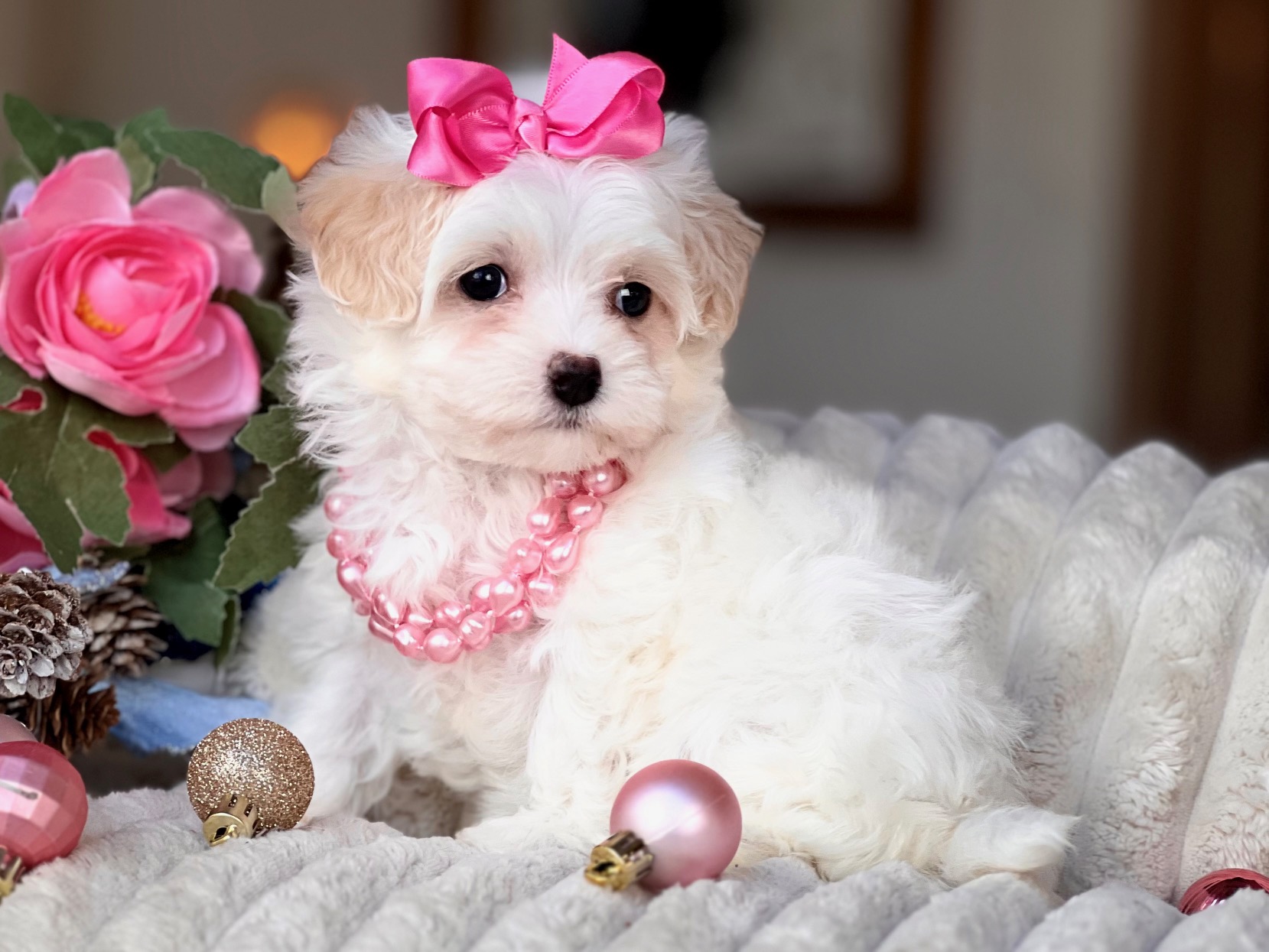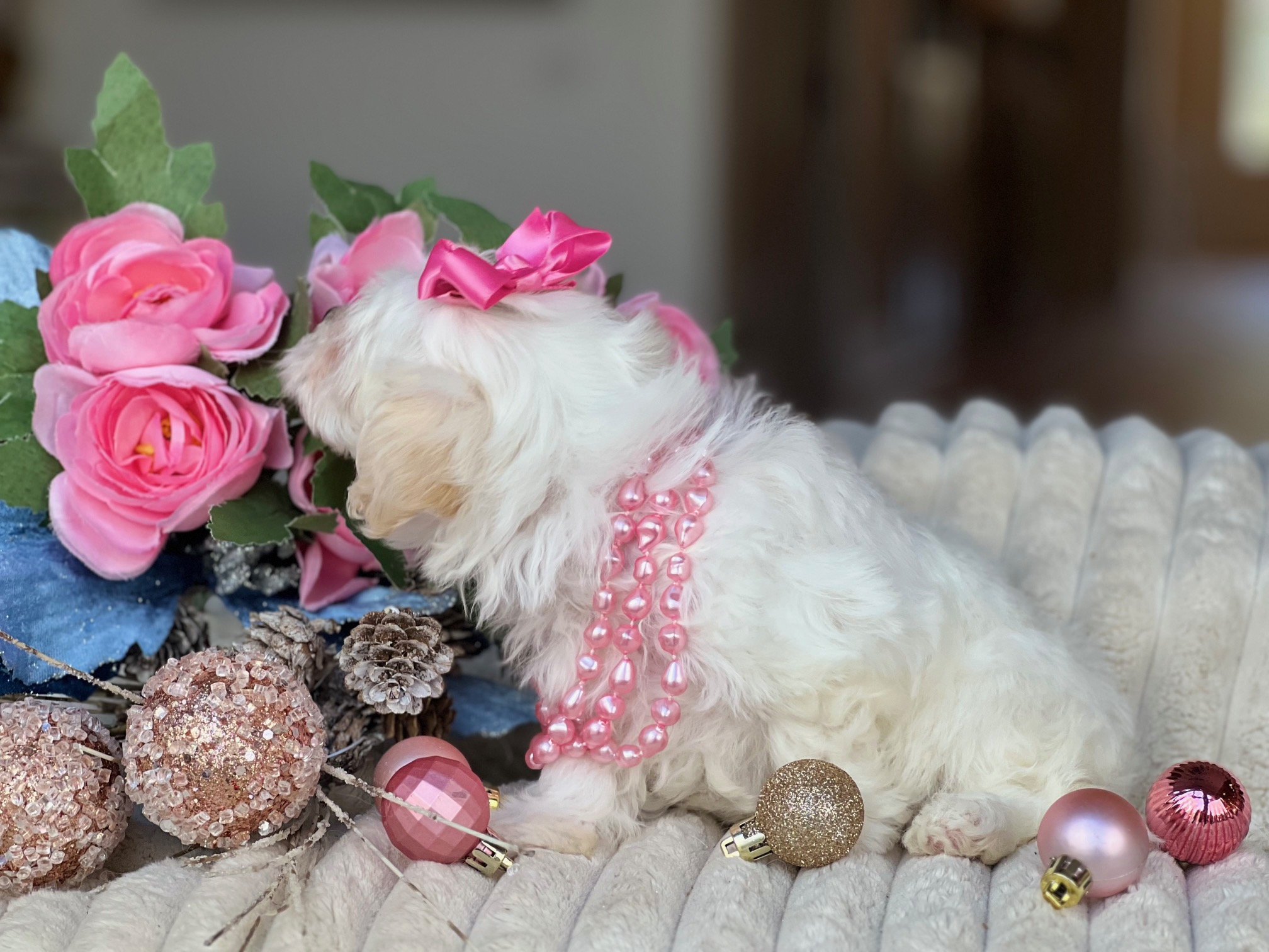 This beautiful little angel is a Maltipoo puppy that we call Pearl. She is a bright white color with soft cream ears. Pearl has a sweet and loving personality, it’s so much fun to watch her bounce around and play with her soft little toys. She is going to make a wonderful addition to some lucky family for years to come!