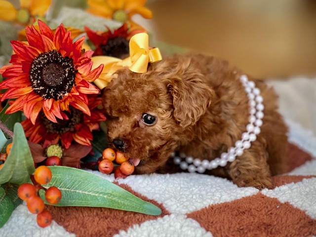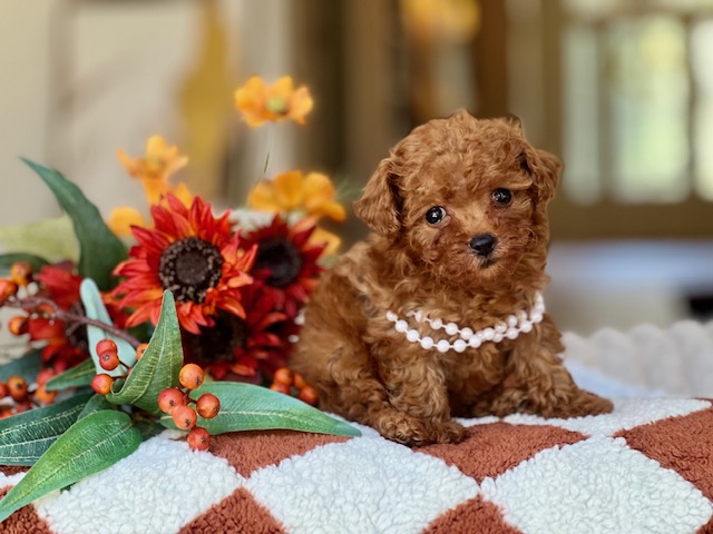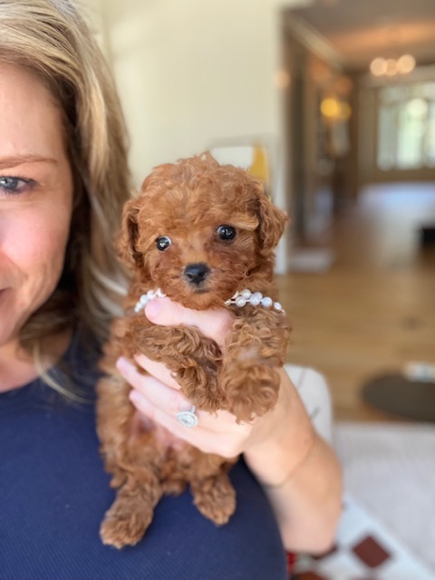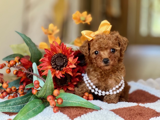 $2,800.00Oh my goodness y’all! Take a look at Princess Pixie, she is a petite little baby girl that will fit in your purse and is just the right size to go on all of your adventures. She is a tiny little Poodle puppy with all of the perfect qualities. She has a beautiful red hair, shiny dark eyes and petite baby doll face. She loves to give kisses, sit in your lap for lots of love and attention, and her absolute favorite is playing with her tiny little toys. don’t miss out on this sweet girl!