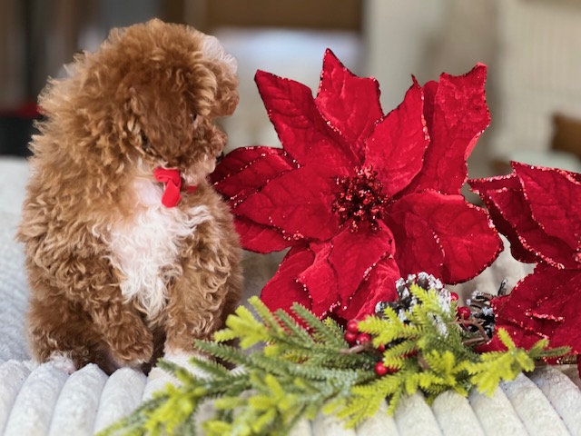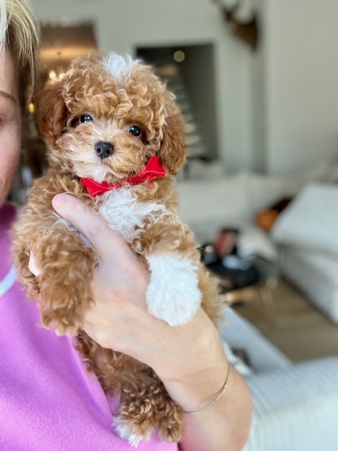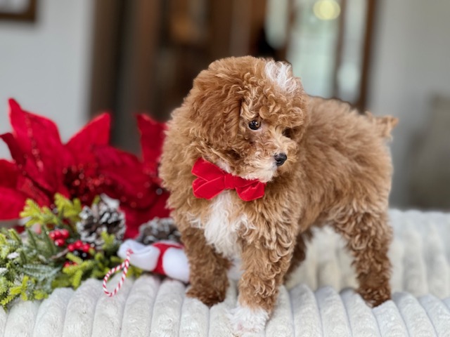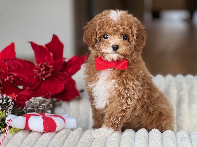 $2,300.00Click Here: More About DasherHi there! I’m Dasher—yep, like the reindeer, but trust me, I’m much cuter and significantly less aerodynamic. I’ve got soft curls, a snazzy red bow, and a face that people keep saying looks like I ordered it off the “adorable” section of the holiday catalog. I’m a happy, loving guy who trots around like I’m late for Santa’s party, and I’d make a great companion because I’m loyal, cuddly, and fully committed to making your home feel like Christmas morning every single day.