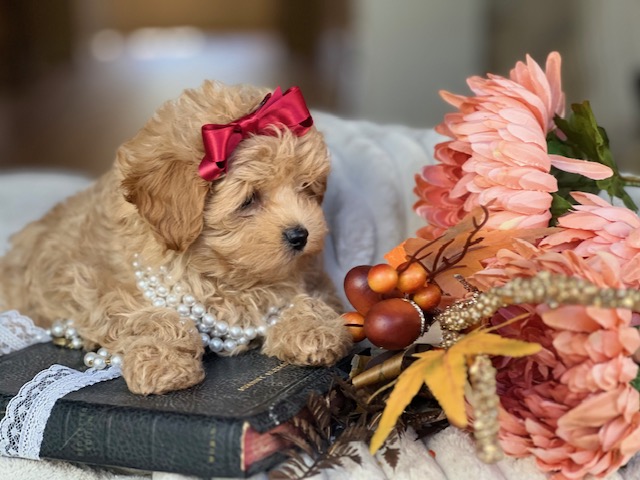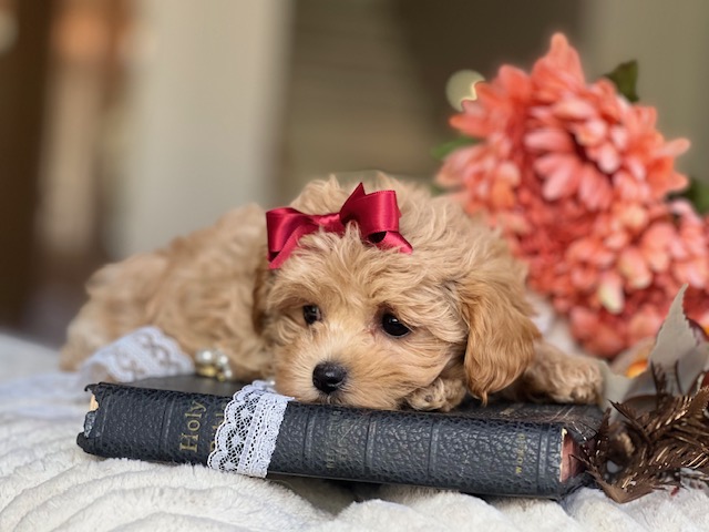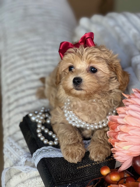 $2,800.00Click Here: More About Twinkle ToesHi there! I’m Twinkle Toes, your tiny apricot Maltipoo girl with dark-apricot curls so soft they could double as holiday tinsel and a teddy-bear face that’s basically Christmas magic. I’m sweet, smart, and I prance everywhere like my paws are dancing to jingle bells—and guess what? I’m also the second-to-last female Maltipoo available before Christmas, so I’m kind of a limited-edition holiday treasure. I’d make a perfect addition to your family because I bring snuggles, sparkle, and just the right amount of festive mischief.
