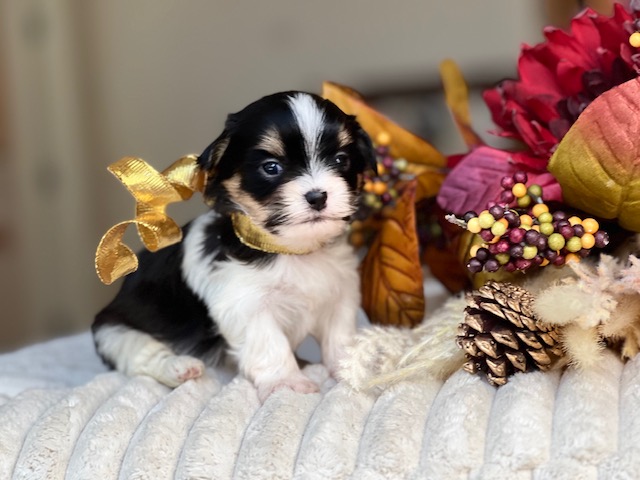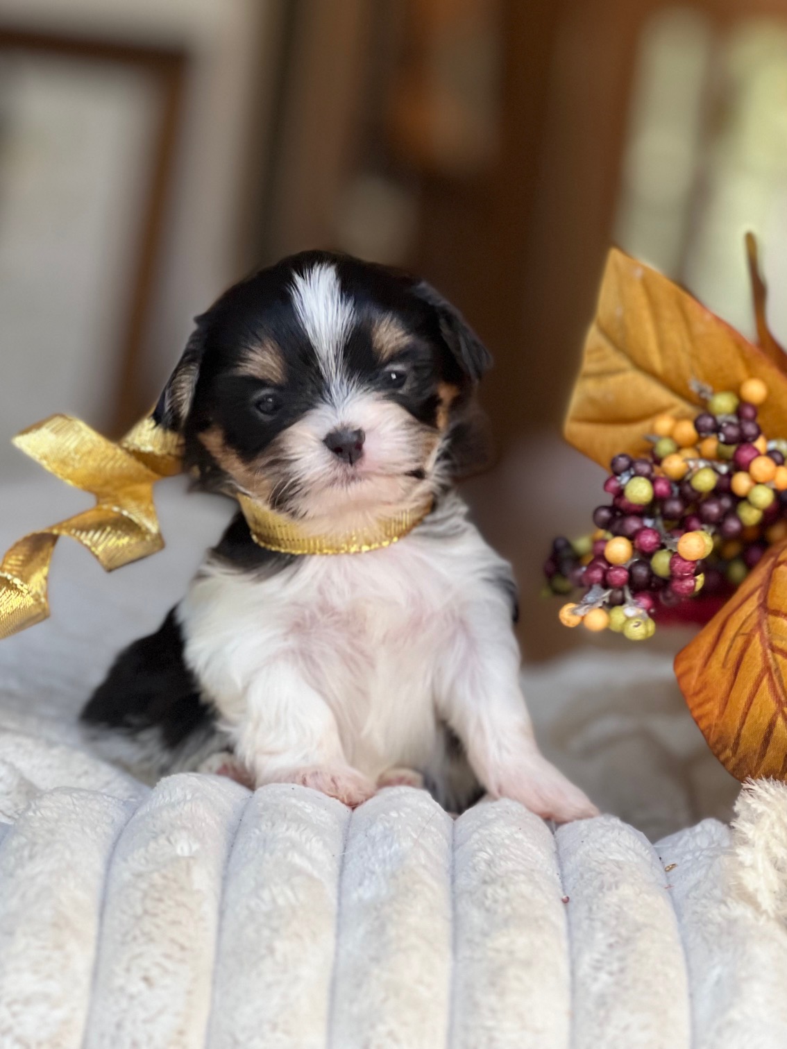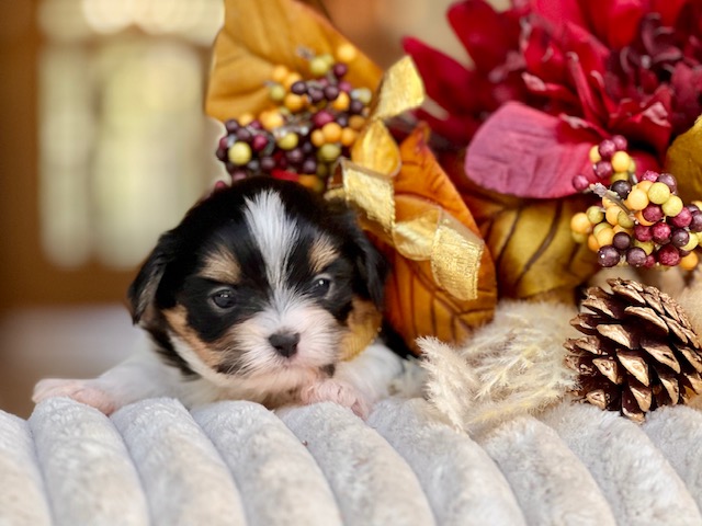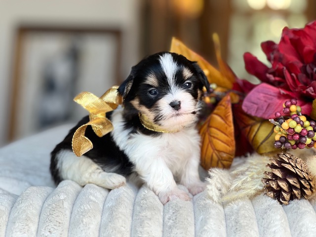 $2,000.00Meet Barlow, this handsome fella is a precious male Mal-Shih puppy. He has that beautiful brown and white coloring with black markings in just the right places. He’s the chubbiest baby in the litter, his little belly is so cute! Just because he is the biggest one now does not mean he’s going to be a bigger puppy. It just means that he’s the best at getting to mamas milk. Mal-Shih are such a wonderful breed! No wonder they are one of the most sought after. Call about Barlow today.